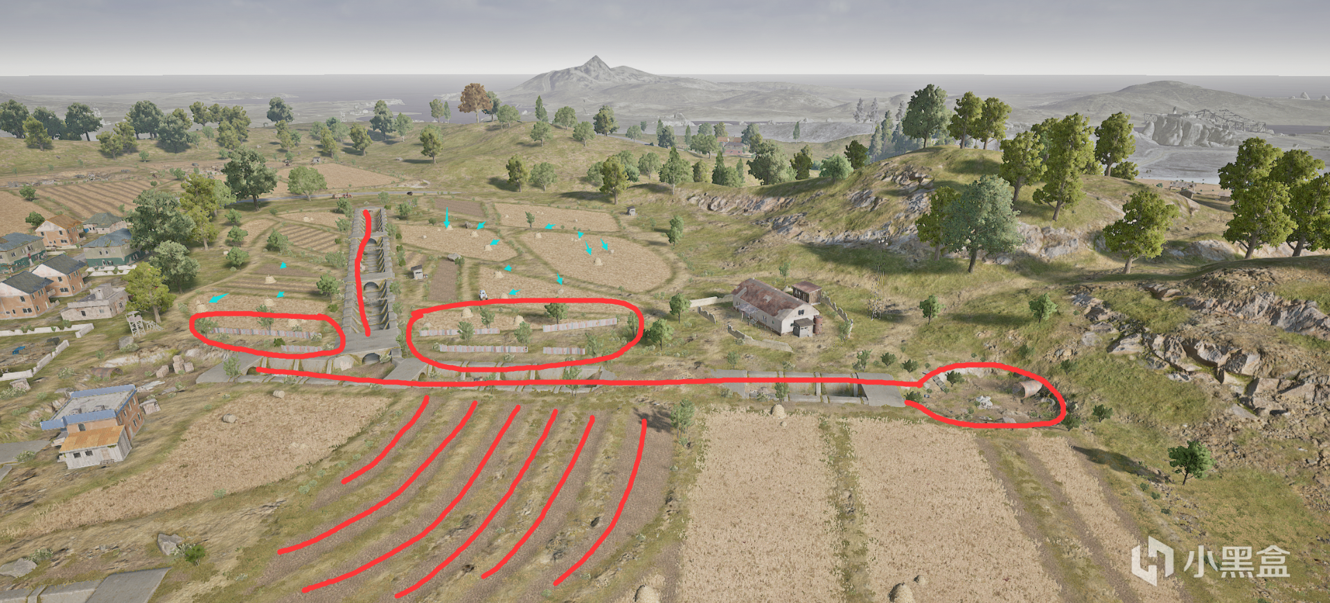 通往东部秃头山的麦田两侧增加了草垛、木箱、栅栏可以规避来自南北两处的枪线