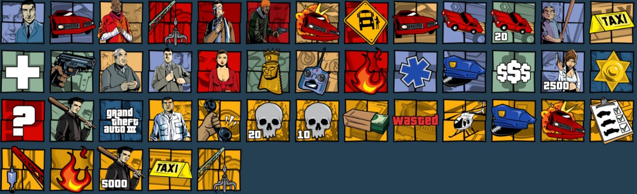 根据gtaforums论坛网友alloc8or的帖文显示,《侠盗猎车手:三部曲 终极版》中三款游戏的全部成就图标及解锁条件已经确定。《GTA:三部曲》中,《GTA3》有44个成就、《罪恶都市》有43个成就、《圣安地列斯》有48个成就,大部分与游戏的主线和支线任务有关,另外还有完成击杀敌人数量的成就等。