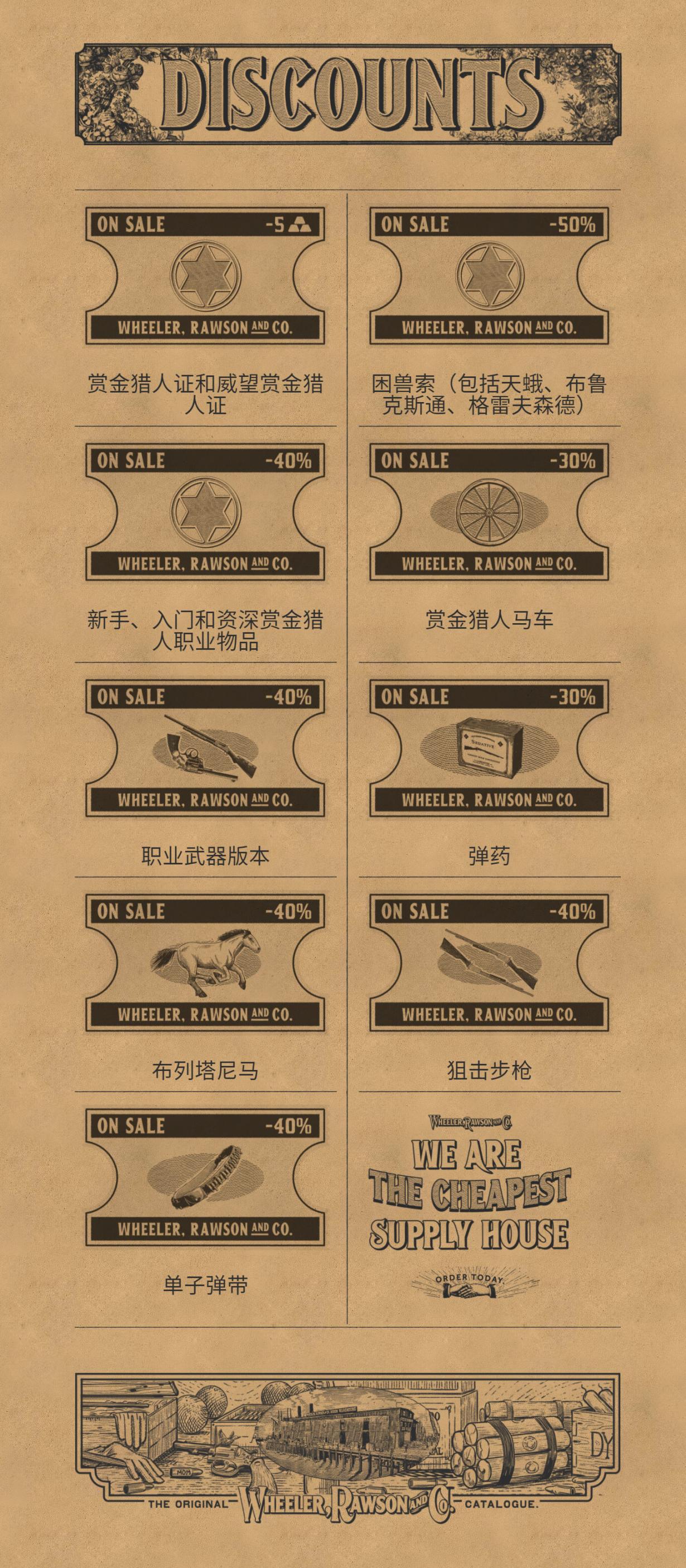 若您打算加入猎头人的行列,可享受赏金猎人证 5 根金条减免优惠、所有困兽索(包括天蛾、布鲁克斯通、格雷夫森德版本)五折、赏金猎人马车七折,以及所有新手、入门和资深赏金猎人职业物品六折。