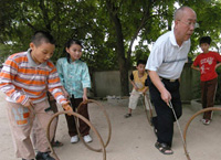 滚铁圈是我国民间的一项群众性体育活动。铁圈是用粗铁丝绞成直径约60公分的环状,再用一条粗铁丝,一端弯成钩的形状,来推送铁环向前滚动,控制其方向,锻炼参与者的协调性。