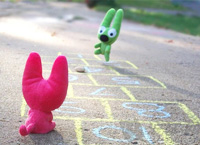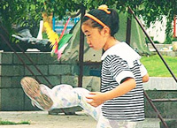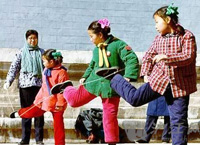 地上画着很多方格,有12格、6格等,然后用算盘珠儿串成一圈,算是跳房子的用具。将算盘珠儿扔在"房子"里,单脚站立,站进房子,单脚将算盘珠按顺序踢进指定格子。